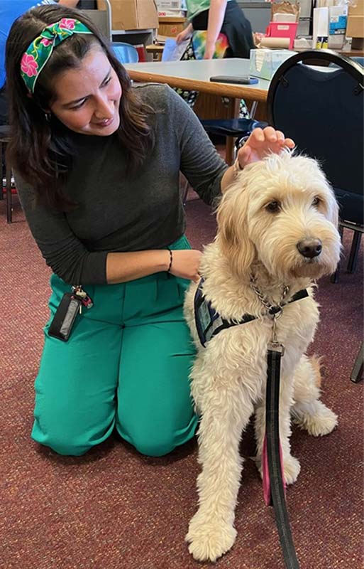 The dogs enthusiastically greeted the students as they came into the room. They spent almost 3 hours providing love, tail wags, friendly faces and even some kisses to everyone.