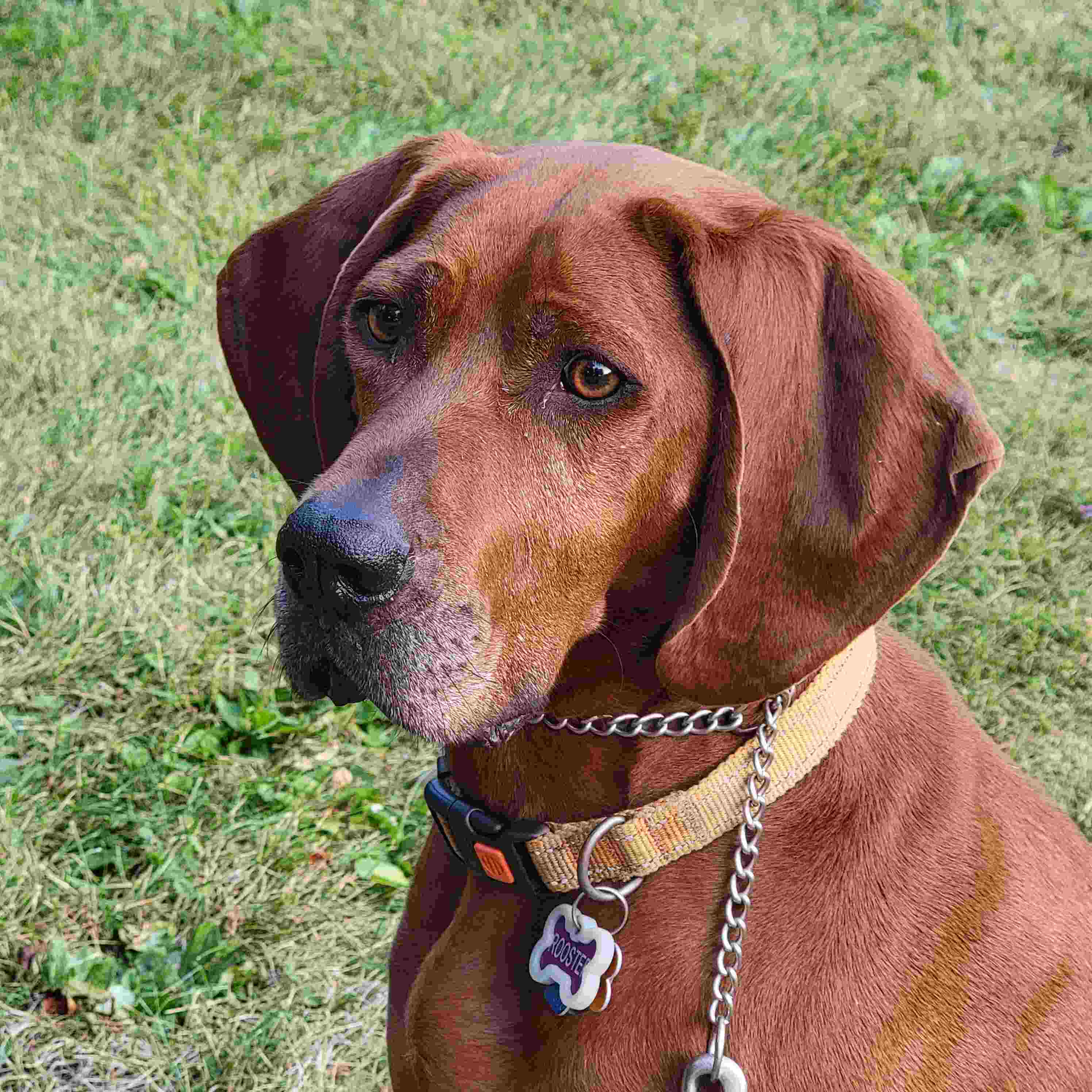 Rooster is a Redbone Coonhound who is 6 years old. He has big floppy ears, a long tail and weighs 90 pounds (which is big for coonhounds.) He is gentle and friendly and likes being with people--children and adults. Rooster really loves to cuddle. When you sit on the floor, he will sit across your lap while you pet him. And, if you're really lucky, he will "sing" for you with his famous coonhound bark